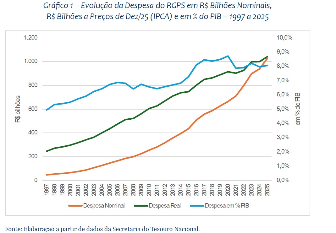 O economista e ex-secretário geral da Previdência, Rogério Nagamine, destacou que o gasto do Regime Geral de Previdência Social (RGPS) saltou de R$ 47 bilhões em 1997 para R$ 1,027 trilhão em 2025. O ritmo de crescimento dessas despesas é particularmente notável nos últimos nove anos, quando dobrou em termos nominais - era de R$ 508 bilhões em 2016. Esses números evidenciam a rápida expansão dos compromissos do sistema e a crescente necessidade de cobertura do Tesouro Nacional para o déficit.