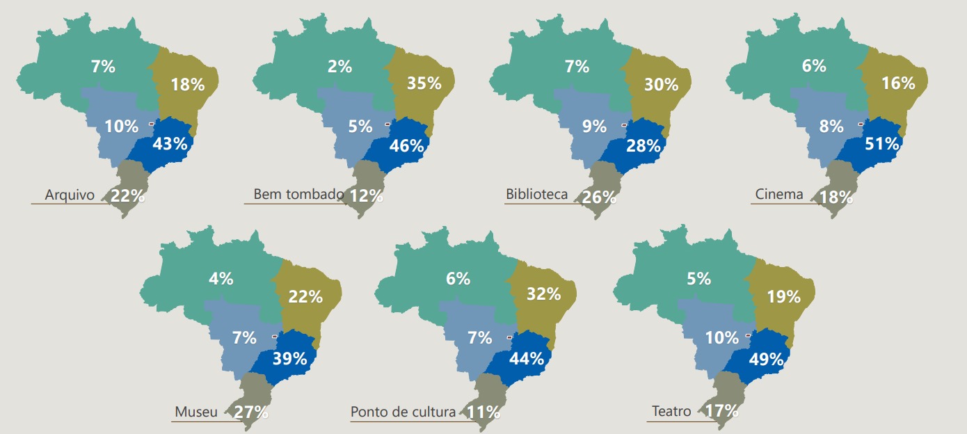 Na distribuição regional, a maioria dos equipamentos foi localizada no Sudeste, com exceção das bibliotecas, que estão mais concentradas no Nordeste.