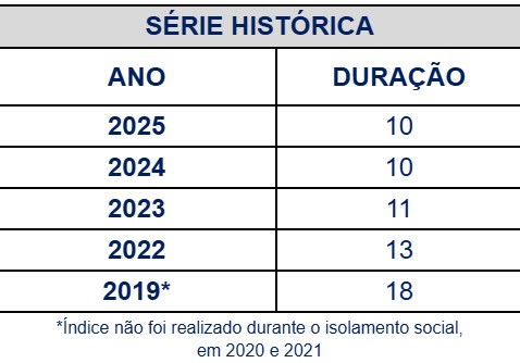 Superam a média nacional os estados de Minas Gerais, Rio de Janeiro e Ceará, com 13 dias úteis de cobertura, São Paulo e Distrito Federal, com 12 dias úteis, e Paraná e Santa Catarina, com 11 dias úteis.
