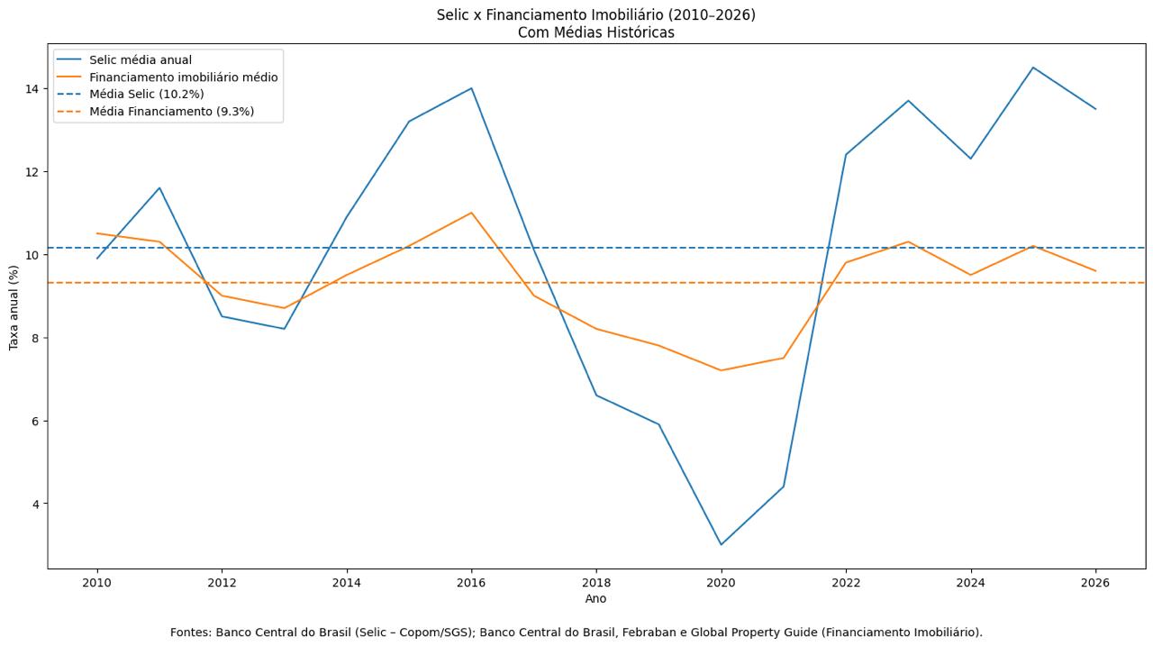 É importante pontuar que a formação desses juros tem características diferentes. A Selic é uma taxa de curto prazo e a taxa estabelecida para um financiamento imobiliário é de longo prazo, de até 30 anos.