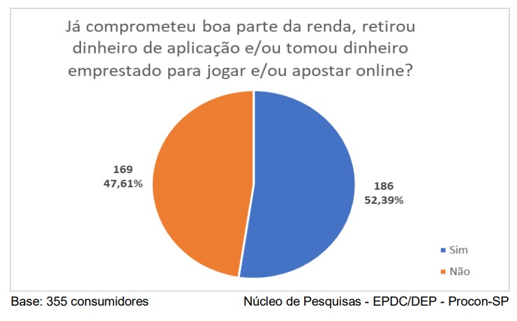 Entre os sinais de alerta no comportamento do público captados pelo estudo, o Procon-SP menciona que, ao realizar apostas, 56,6% dos entrevistados afirmam se sentir influenciados por propagandas com celebridades. Outros 62,2% relatam já ter enfrentado problemas com a empresa que oferta jogos e apostas, sendo o principal a recusa em pagar o prêmio e 52,4% alegam já ter comprometido boa parte da renda, utilizando dinheiro aplicado ou empréstimo para jogar.