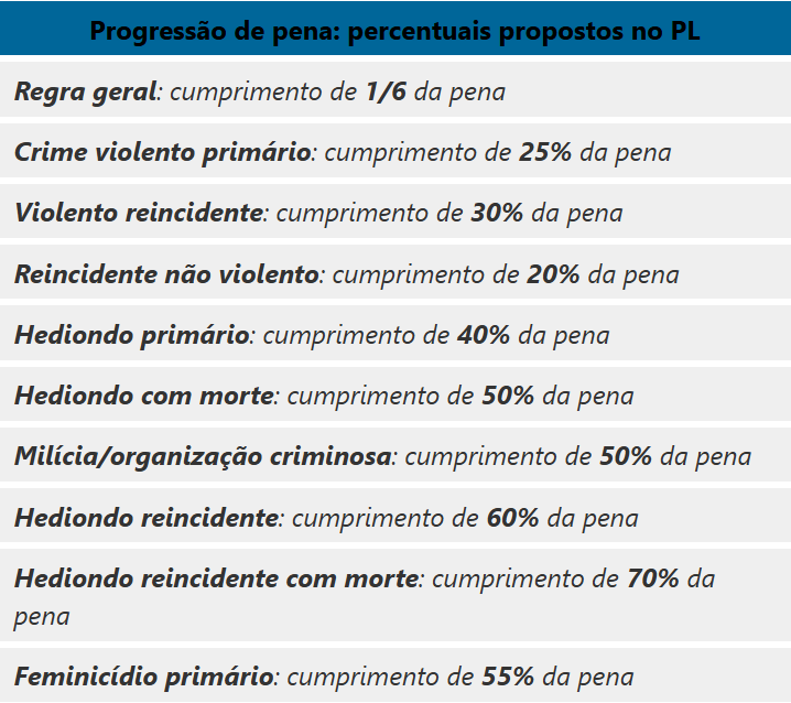 Para crimes violentos contra a pessoa ou patrimônio, o texto cria porcentuais próprios de cumprimento da pena para a progressão de regime. O condenado primário deverá cumprir 25% da pena, enquanto o reincidente nesses crimes deverá cumprir 30%. Já o reincidente em crimes não violentos terá exigência de 20%.